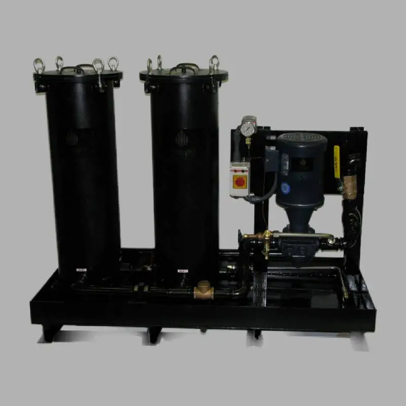 Sistema de filtración de doble carcasa diseñado para instalaciones permanentes. Con una capacidad de flujo de hasta 40 GPM, este equipo es ideal para depósitos de gran tamaño (hasta 4,320 galones), garantizando la purificación continua de aceites hidráulicos, lubricantes y diésel.